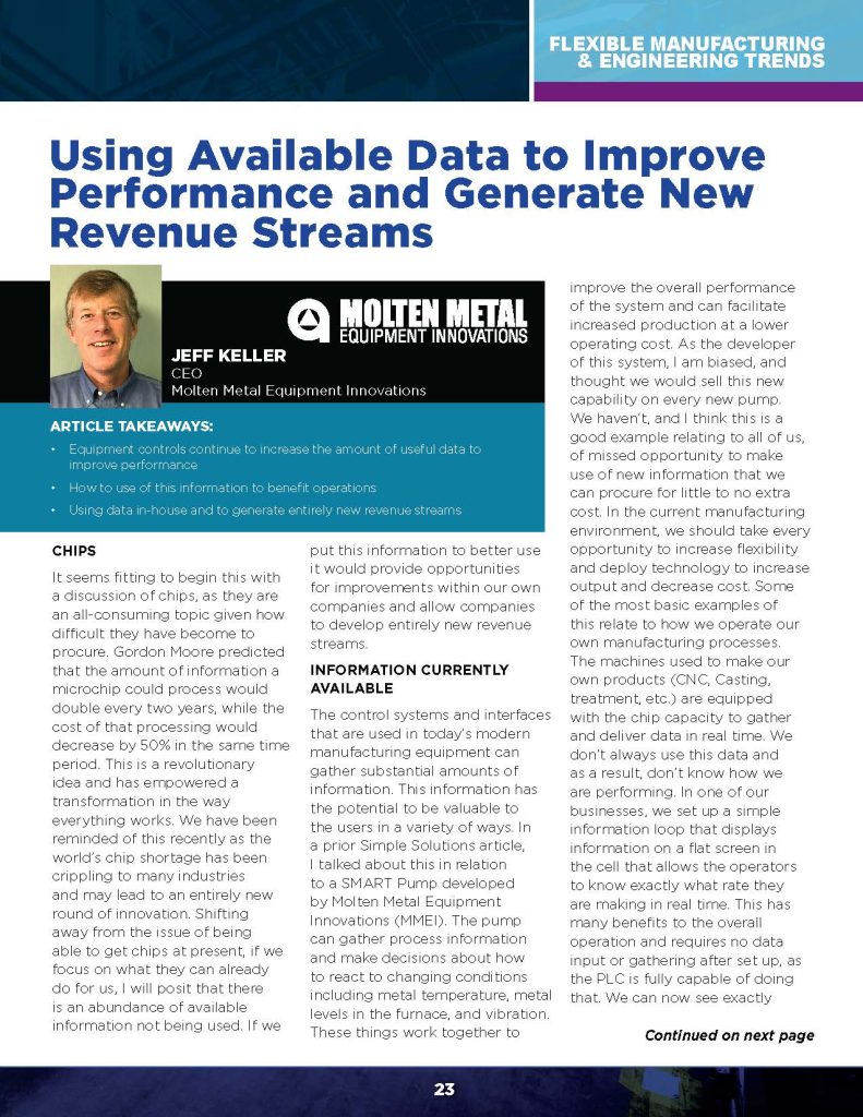 The control systems and interfaces that are used in today’s modern manufacturing equipment can gather substantial amounts of information. This information has the potential to be valuable to the users in a variety of ways. In a prior Simple Solutions article, I talked about this in relation to a SMART Pump developed by Molten Metal Equipment Innovations (MMEI). The pump can gather process information and make decisions about how to react to changing conditions including metal temperature, metal levels in the furnace, and vibration. These things work together to improve the overall performance of the system and can facilitate increased production at a lower operating cost. As the developer of this system, I am biased, and thought we would sell this new capability on every new pump. We haven’t, and I think this is a good example relating to all of us, of missed opportunity to make use of new information that we can procure for little to no extra cost. In the current manufacturing environment, we should take every opportunity to increase flexibility and deploy technology to increase output and decrease cost. Some of the most basic examples of this relate to how we operate our own manufacturing processes. The machines used to make our own products (CNC, Casting, treatment, etc.) are equipped with the chip capacity to gather and deliver data in real time. We don’t always use this data and as a result, don’t know how we are performing. In one of our businesses, we set up a simple information loop that displays information on a flat screen in the cell that allows the operators to know exactly what rate they are making in real time. This has many benefits to the overall operation and requires no data input or gathering after set up, as the PLC is fully capable of doing that. We can now see exactly what we are doing and can make immediate adjustments, analyze trends, and look for root causes to address for improvement. This has generated immediate, measurable, improvement. This is a basic issue, and we should have been doing it long ago. There are many more examples of using what we already have for continuous improvement.