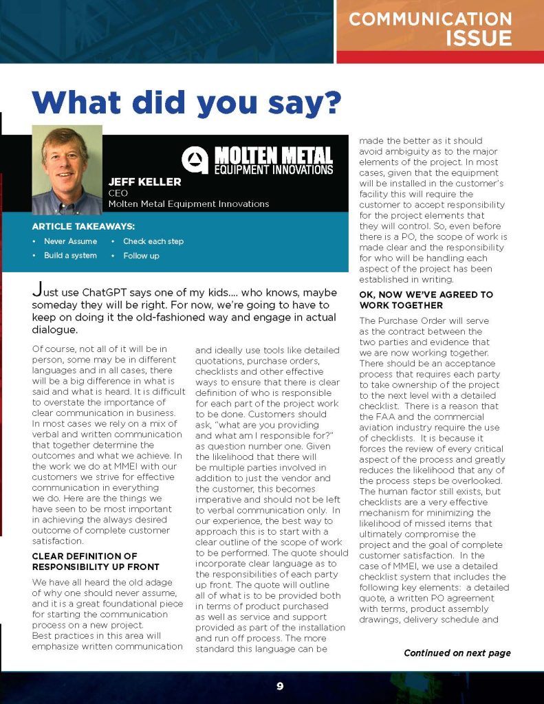 Just use ChatGPT says one of my kids…. who knows, maybe someday they will be right. For now, we’re going to have to keep on doing it the old-fashioned way and engage in actual dialogue. Of course, not all of it will be in person, some may be in different languages and in all cases, there will be a big difference in what is said and what is heard. It is difficult to overstate the importance of clear communication in business. In most cases we rely on a mix of verbal and written communication that together determine the outcomes and what we achieve. In the work we do at MMEI with our customers we strive for effective communication in everything we do. Here are the things we have seen to be most important in achieving the always desired outcome of complete customer satisfaction.